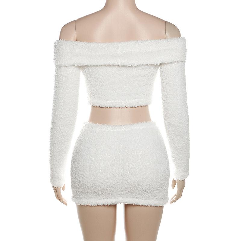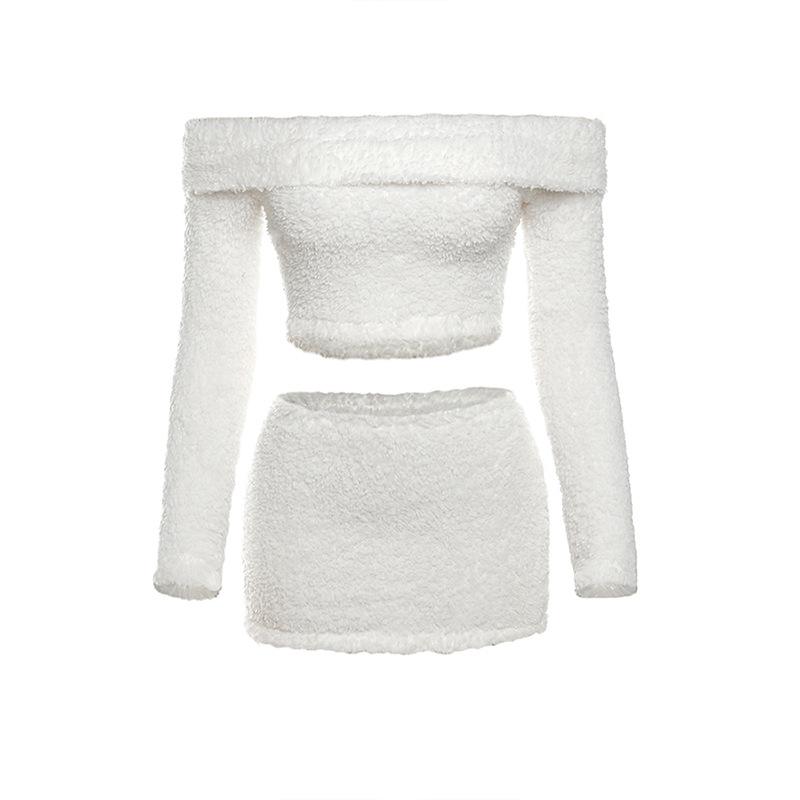 acelimosf™-Fluffy solid off shoulder long sleeve mini skirt set