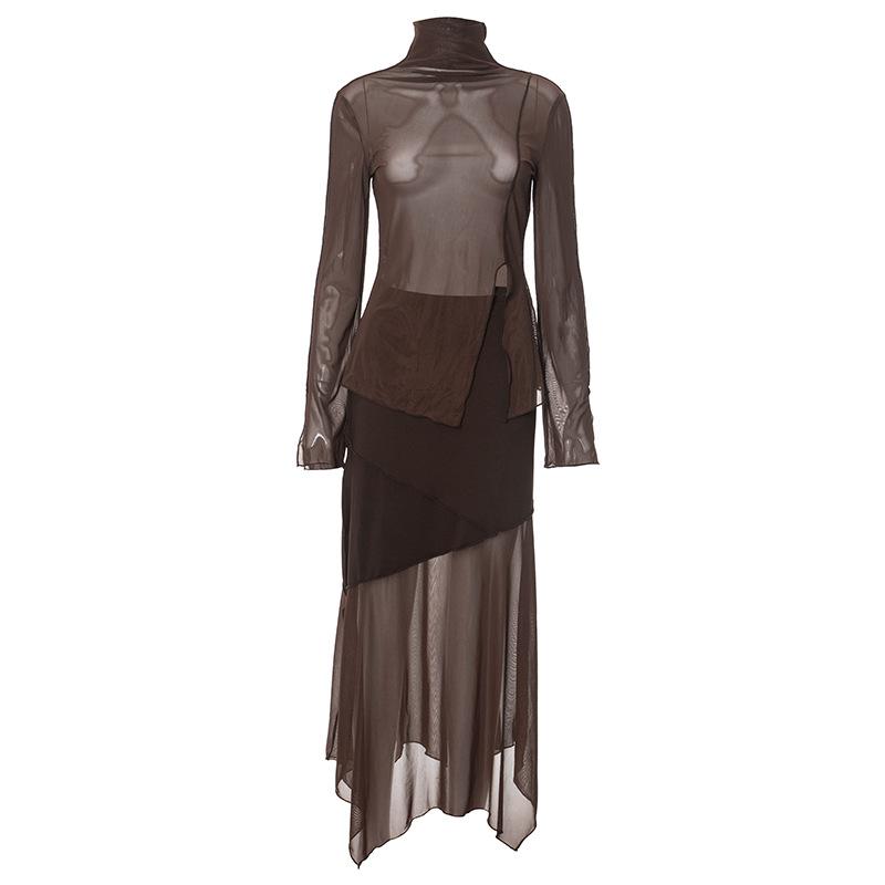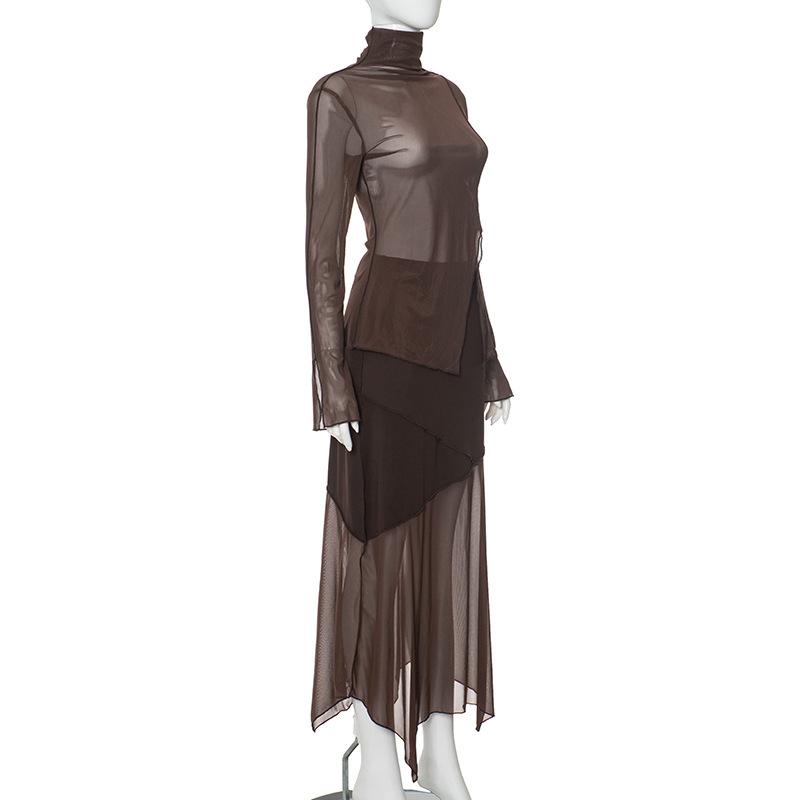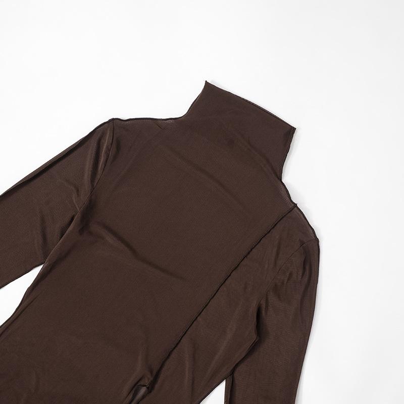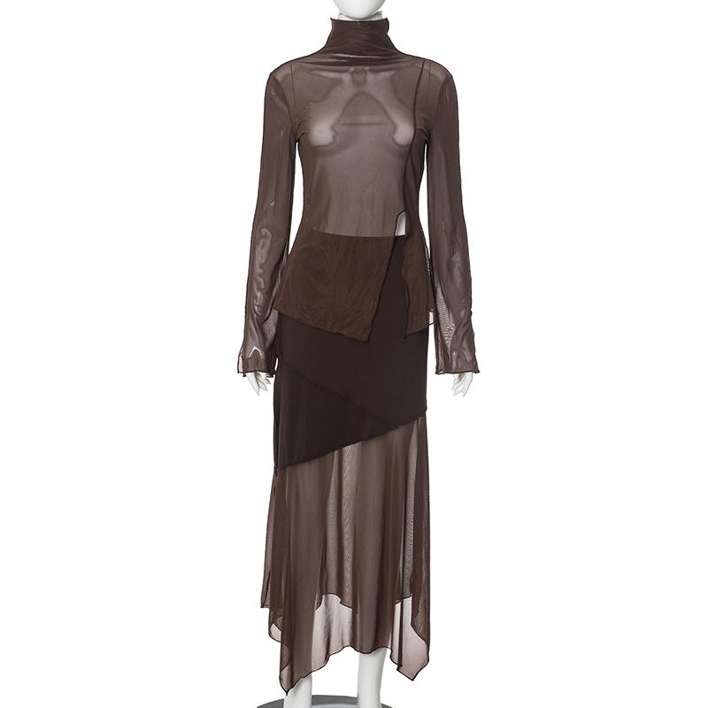 acelimosf™-High neck long sleeve mesh slit midi skirt set