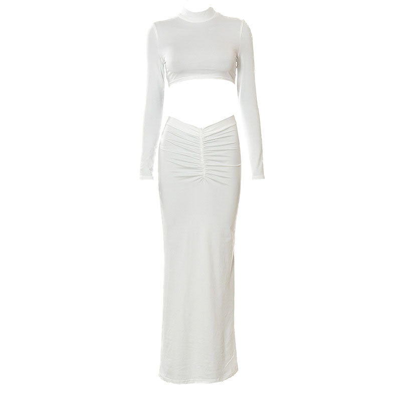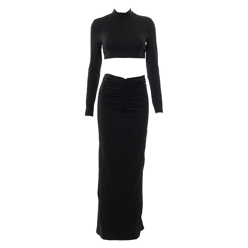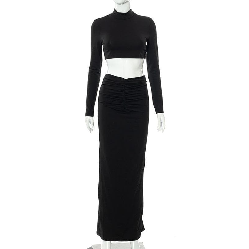 acelimosf™-High neck long sleeve ruched solid maxi skirt set y2k 90s Revival Techno Fashion