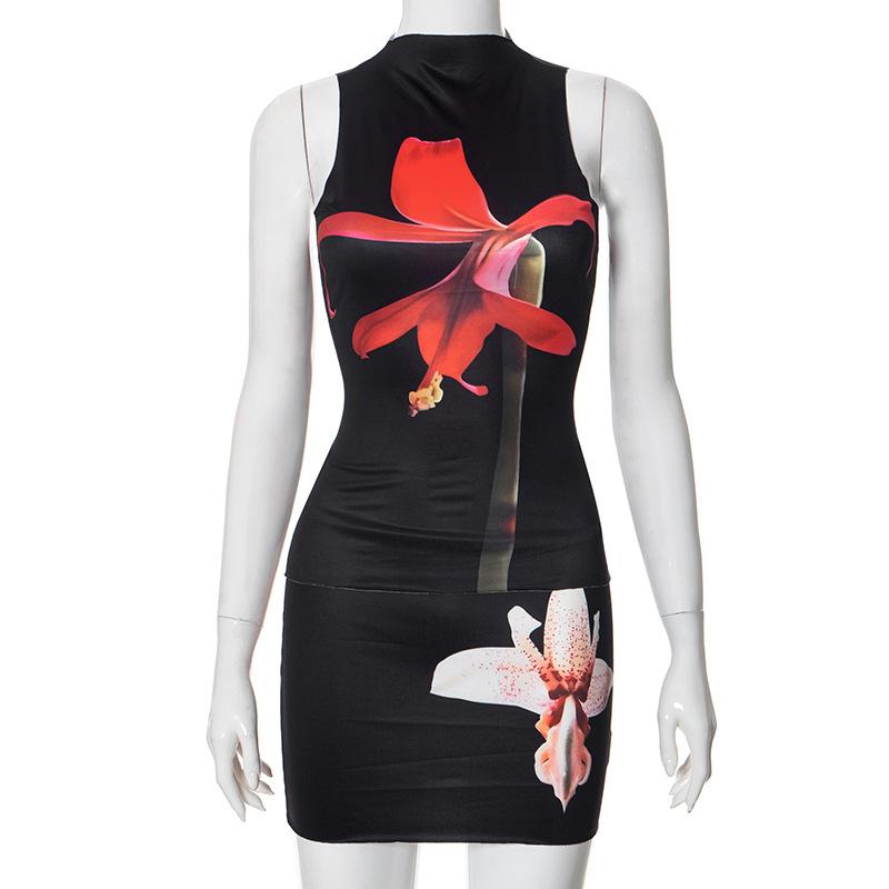 acelimosf™-High neck sleeveless flower print mini skirt set