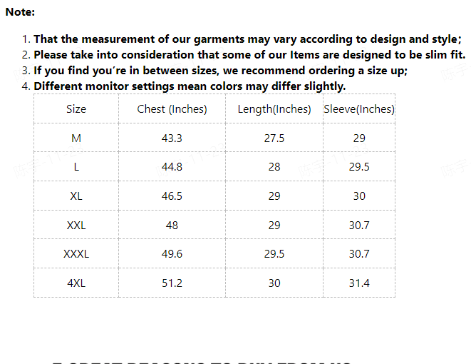 | Size | Chest (Inches) | Length(Inches) | Sleeve(Inches) |