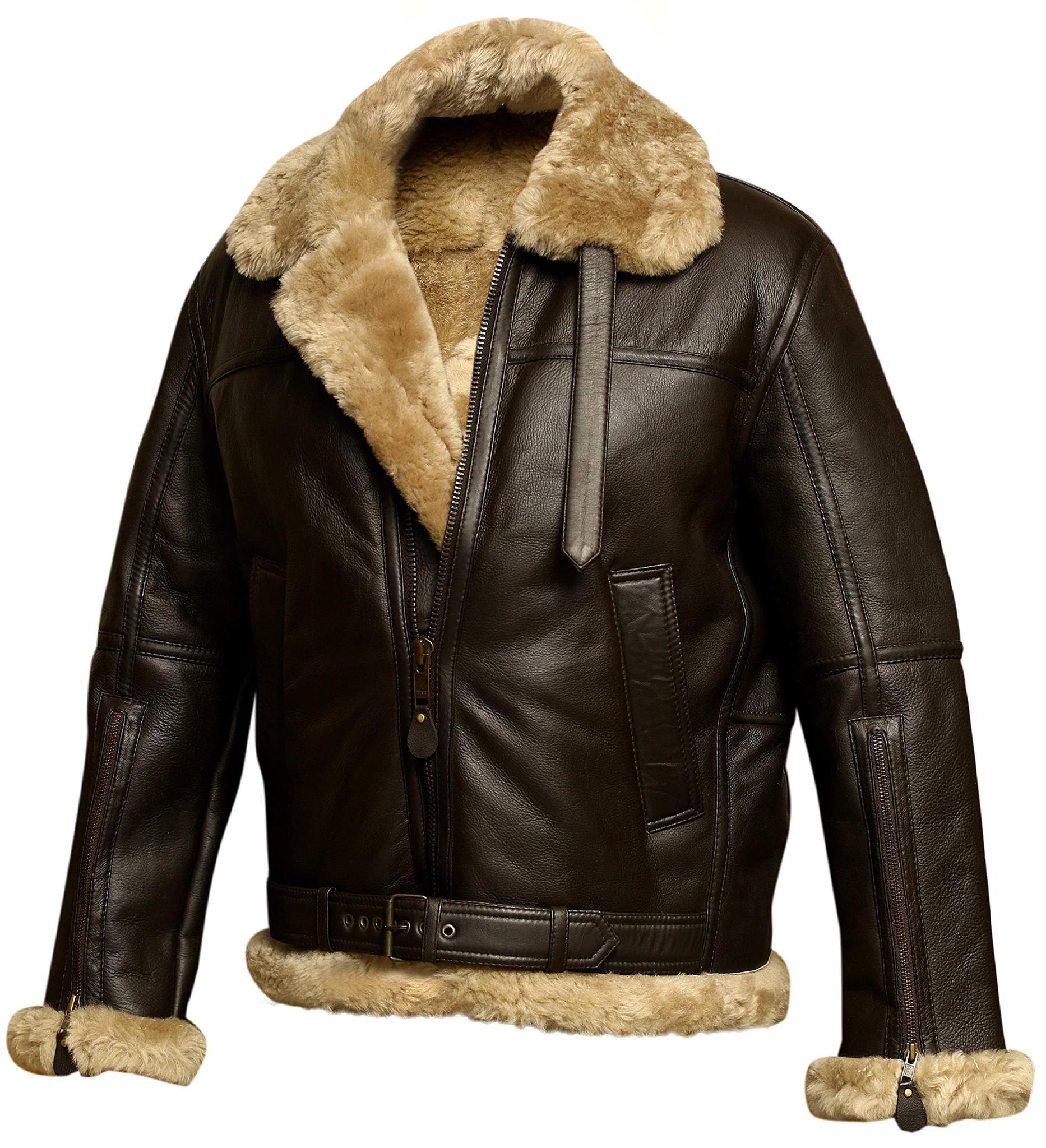 Previously provided with outerwear which kept very little body heat, the sheepskin B-3 bomber aviator flying fighter pilot jackets were introduced in WWII to ensure that crewman were kept warm while flying at high altitudes in unpressurized cabins. We have perfected the long lost leather finish once used and added side entry hand warmer pockets updating this men's b3 brown bomber real shearling sheepskin jacket to contemporary standards. Made With Real Lambskin Leather and Sheep Shearling for extreme winters.