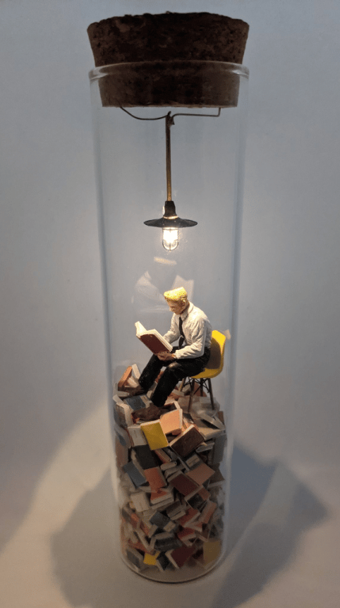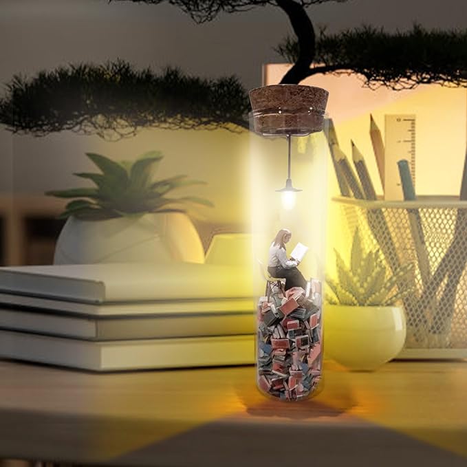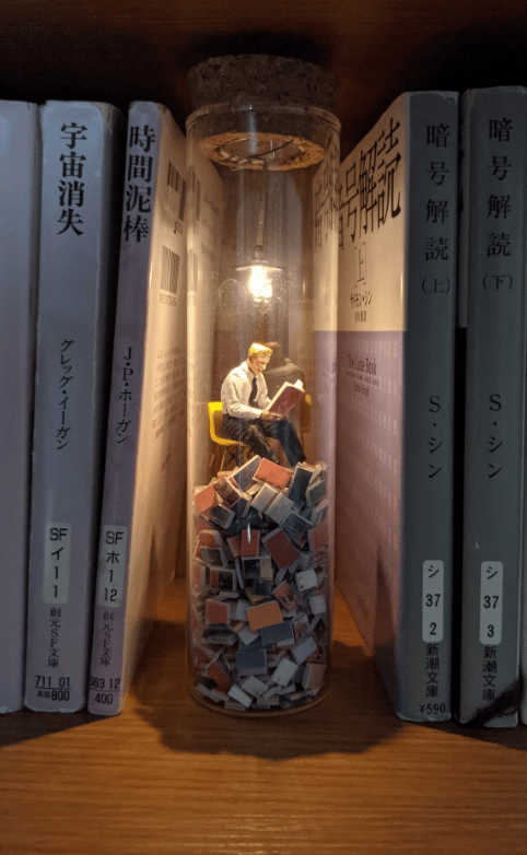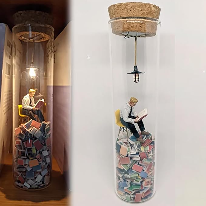 You will be fascinated by the delicate and beautiful world of the "test tube diorama", which expresses the sad atmosphere of a bibliophile reading on a mountain of beloved books. The small diorama is made up of countless books stacked like mountains. On a mountain of books, a man sits on a chair and opens a book. No matter how many books you read, you can't read them all...
